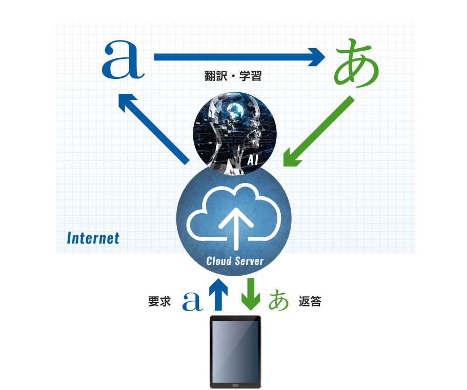 アプリケーションに搭載される翻訳ソフトを使用するのではなく、アプリを通してクラウドサーバーへ接続。あらゆる環境から接続され、様々なシチュエーションの翻訳を行うことで自己学習を続ける先端のAIプログラムが通訳リクエストに即座に返答する事で、常に最新の翻訳パターンによる通訳を実現。